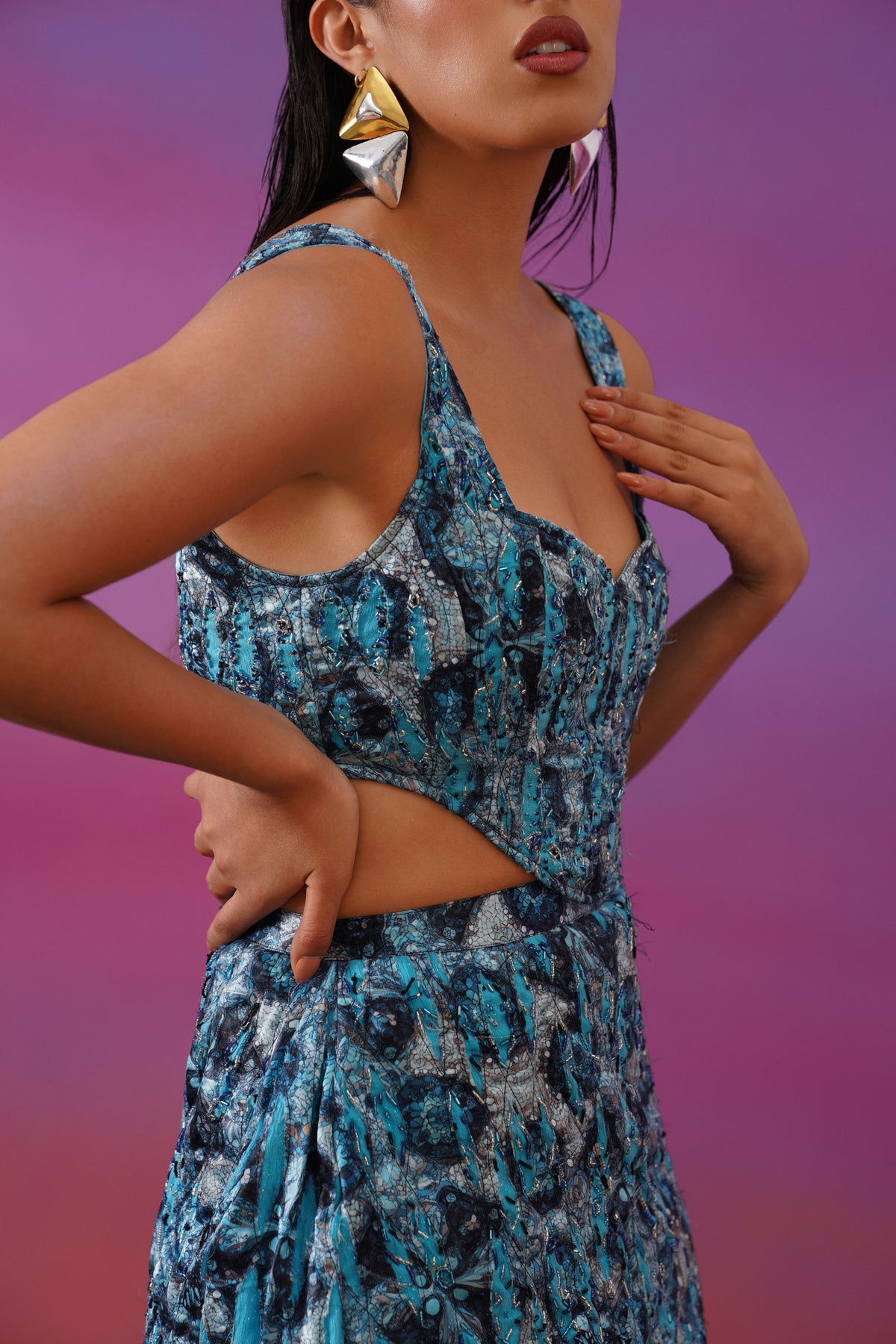 Crafted in a rich blend of oceanic blues and deep inky tones, the corset features a textured, almost painterly surface that feels organic and layered. Subtle embellishments catch the light gently, reminiscent of pearls glimmering beneath still water. The structured bodice sculpts the form with precision, while the neckline and straps remain understated, allowing the fabric to speak for itself.