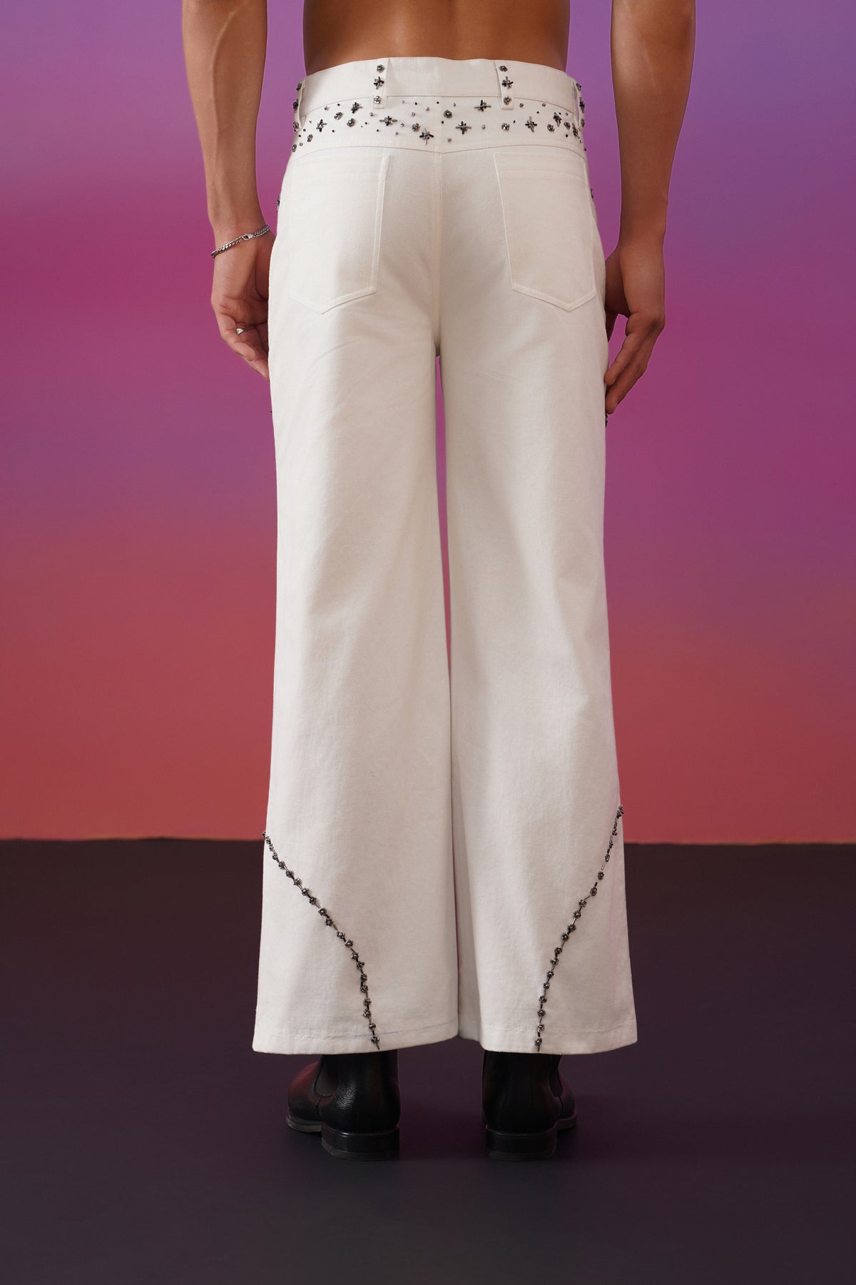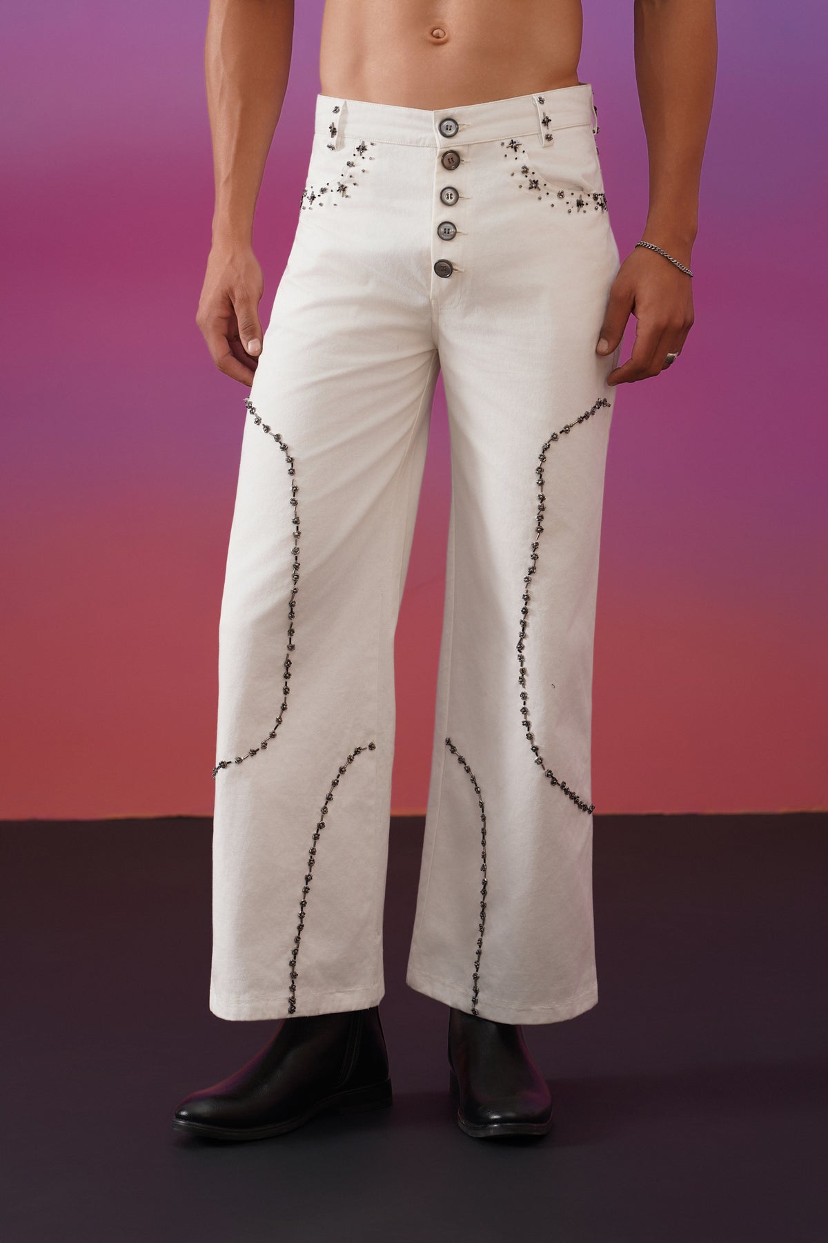 Cut in a clean ivory base, the silhouette is structured yet fluid, allowing ease of movement without losing form. Delicate hand-applied embellishments trace organic, constellation-like paths along the legs, creating a sense of motion—like starlight gently falling through the night. The high-waisted fit and buttoned front lend a vintage sensibility, grounding the celestial detailing in timeless tailoring.