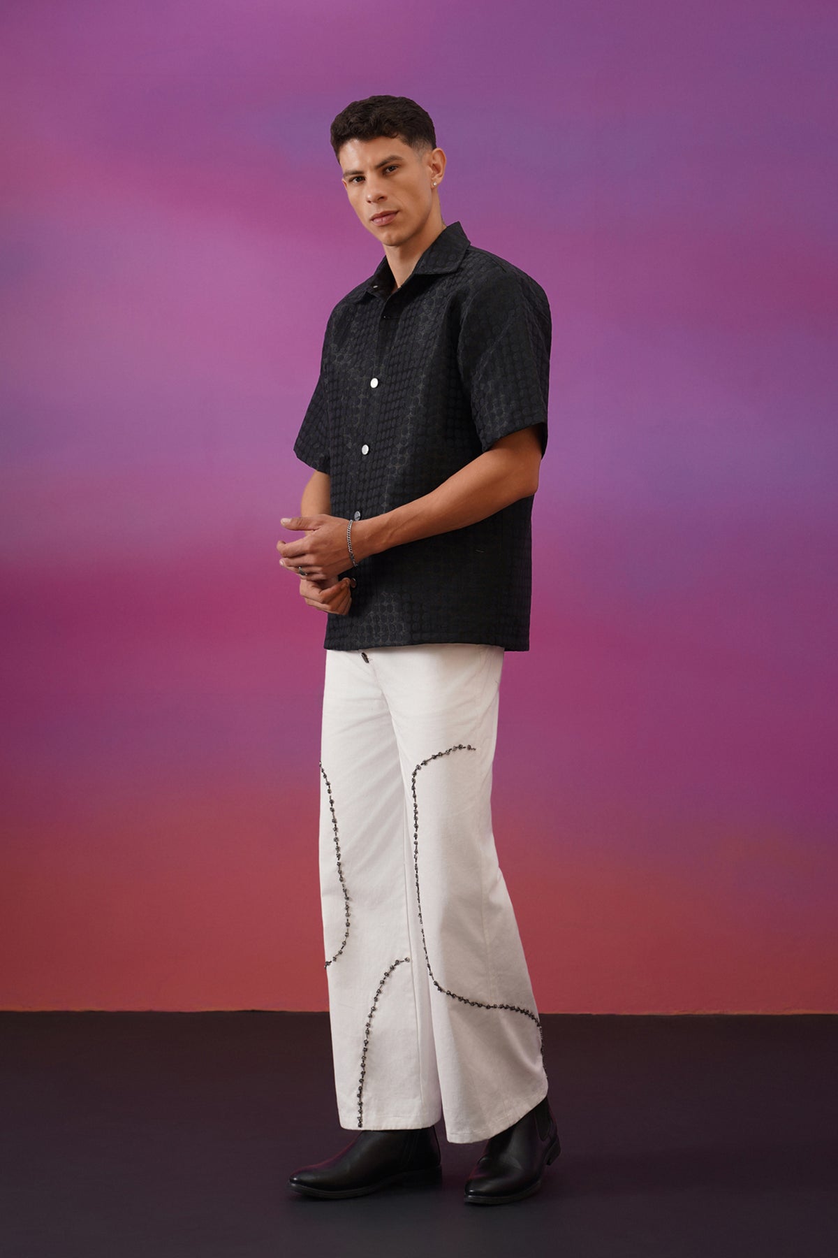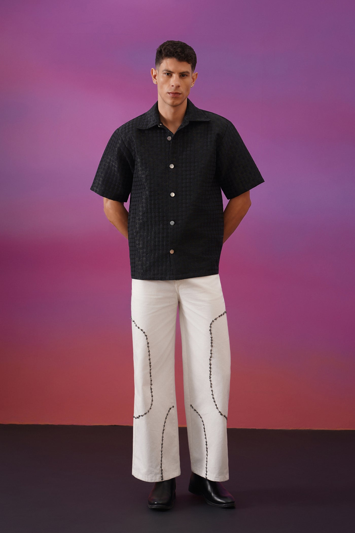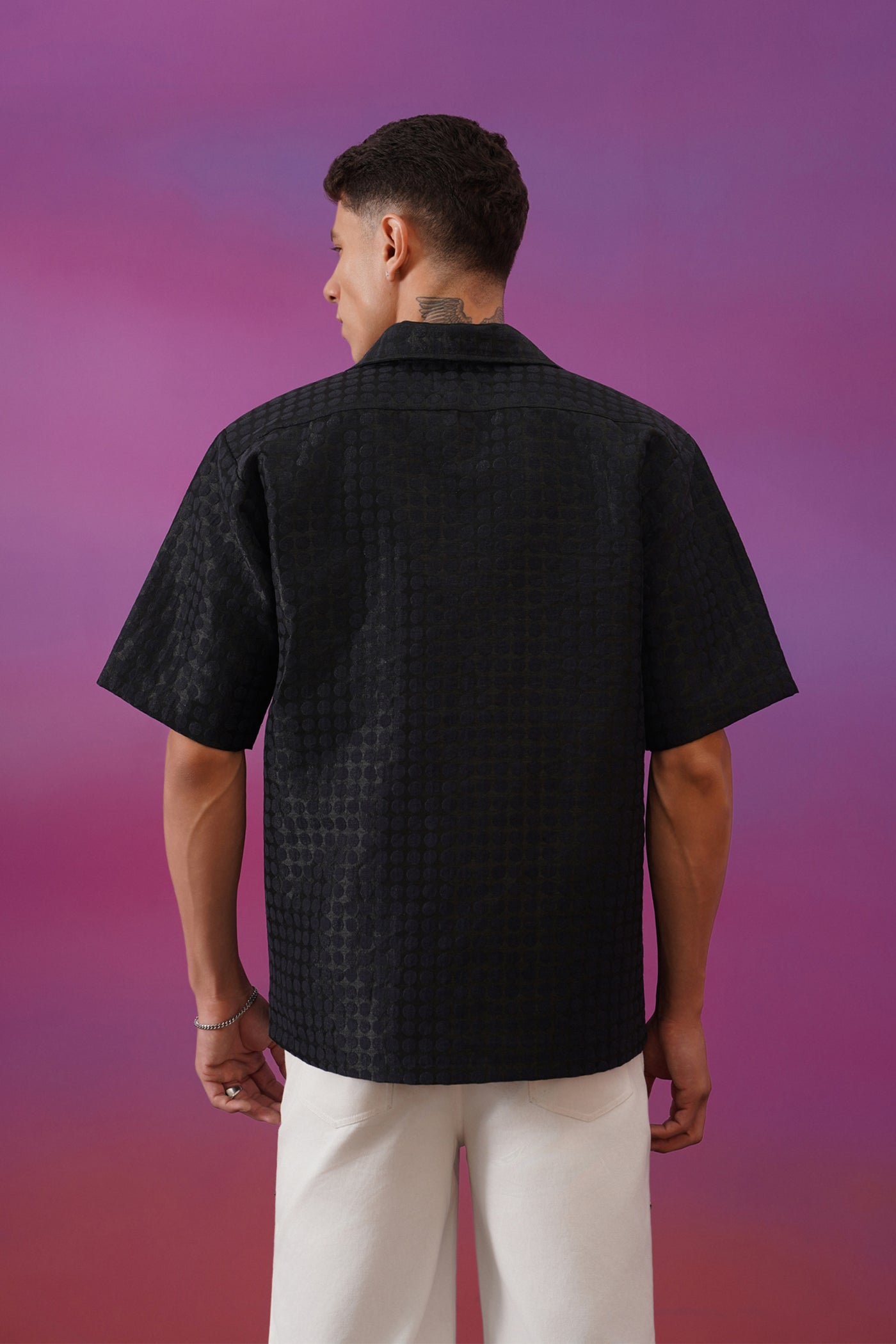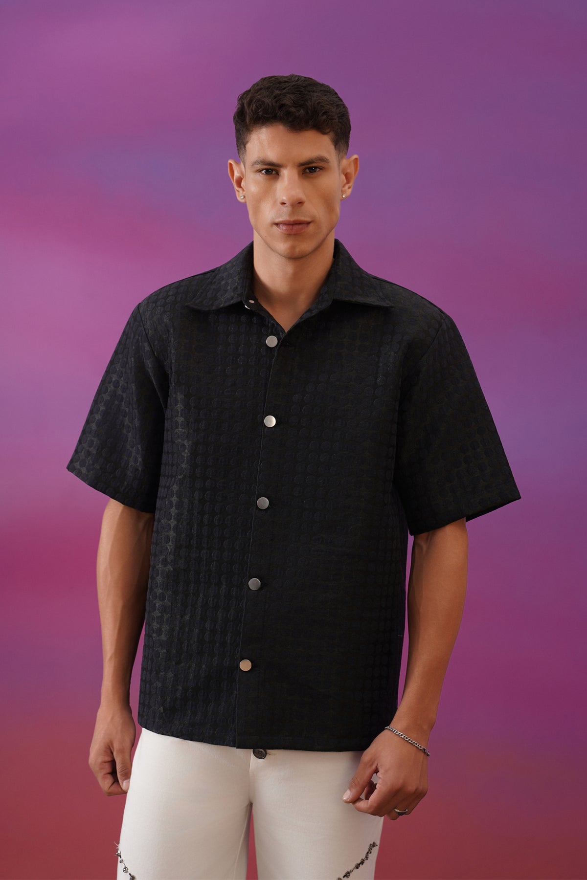 Crafted in a deep black tone, the shirt features a subtle woven texture that reveals itself only in light, echoing the layered richness of midnight skies. The short-sleeve silhouette is relaxed yet deliberate, striking a balance between ease and structure. Clean lines, a classic collar, and understated buttons keep the design timeless, allowing texture and form to carry the narrative.